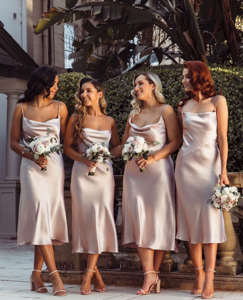 Airy chiffon, lace or silk dress is always gorgeous. Comes in millions of colors, whether you're a mix-and-match group or a part of a matching bridesmaid lineup. In middle or maxi length such dresses will look gorgeous and modest.