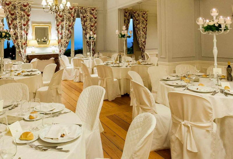 "Salone Azzurro" at the 1° floor of the Villa used in case of bad weather for the dinner sitting, surrounded by a terrace with the Etna and the sea view. Capacity over 200 people.