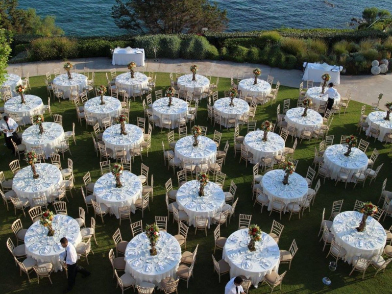 The grass reception area can accommodate 300 people seating; however, more tables can be placed on the hard surface or around the pool, based on event requirements.