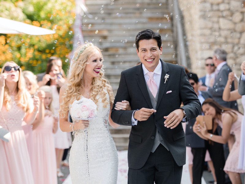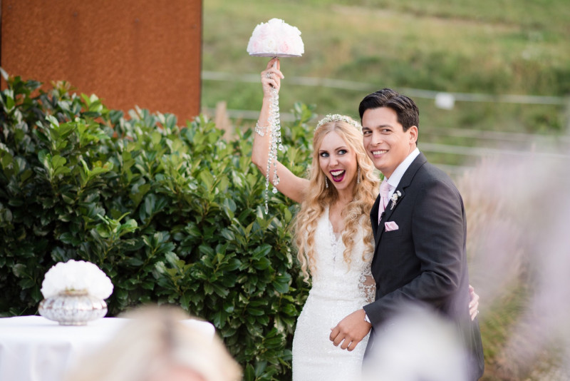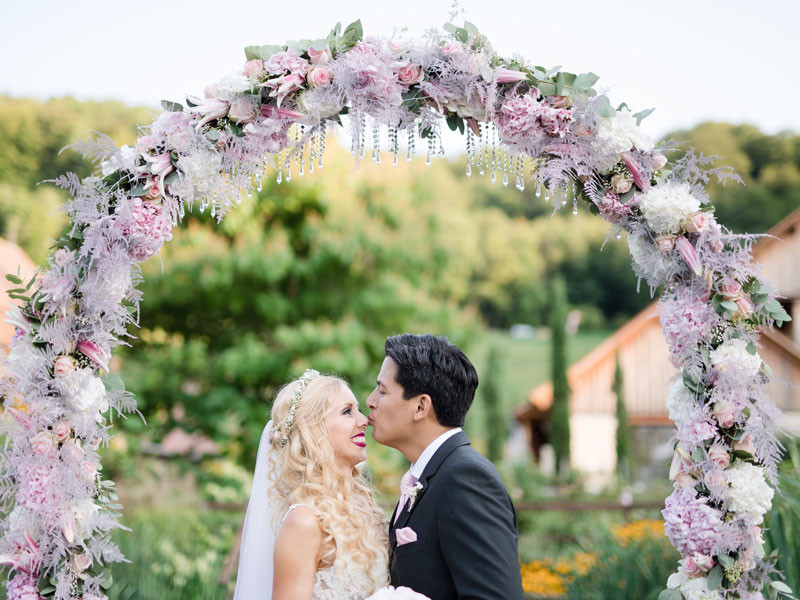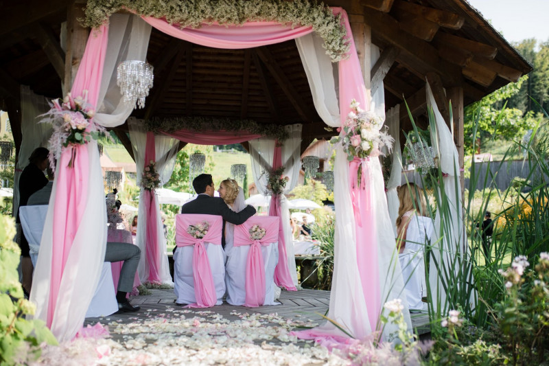 Two small, idyllic ponds, a romantic pavilion on the jetty, two further jetties with enough space for the guests, all clad in white, surrounded by vineyards from southern Styria - you couldn't dream of a more beautiful setting for a wedding.